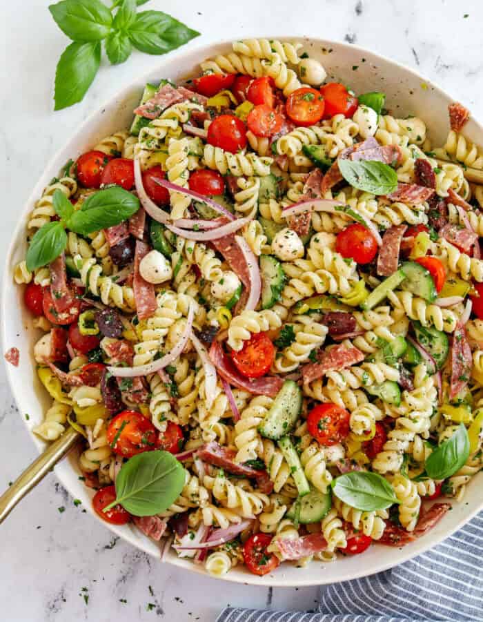 This Italian pasta salad recipe is hands down one of our absolute favorite pasta salads. So many flavorful ingredients like spicy salami, juicy tomatoes, fresh mozzarella, pepperoncini, tossed with warm pasta and the most delicious homemade Italian dressing! This easy Italian pasta salad is perfect for picnics or cookouts and makes a great side dish when grilling chicken, fish or steak. The best part is this pasta salad can be enjoyed warm or cold and has SO much flavor in every single bite!