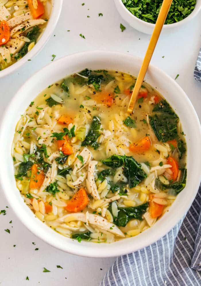 Easy and delicious Lemon Chicken Orzo Soup loaded with tender chicken, fresh veggies, and leafy greens all simmered in the most flavorful broth! Easily made in one pot for a cozy weeknight dinner the whole family will love!